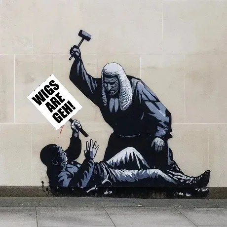 Meme del último mural de Banksy aparecido en los tribunales de Londres representando a un juez golpeando a un manifestante, el cual fue mandado tapar por la justicia en menos de 1 hora (Vaya, para esto sí que se dan prisa) y posteriormente borrado para siempre.