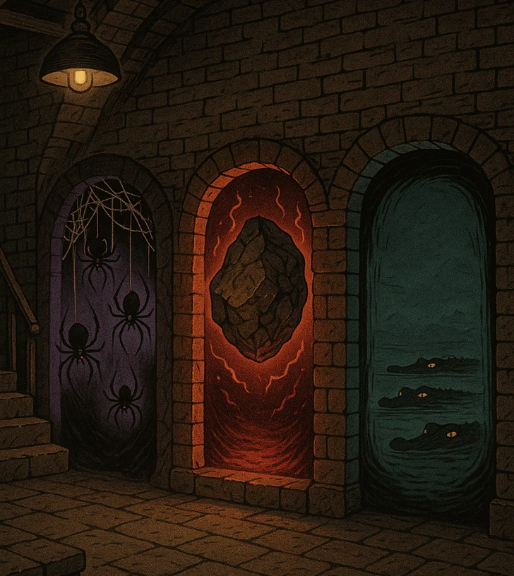 …cuando escuchó unos gritos desesperados que provenían de una casa cercana. Sin pensarlo, corrió hacia allí. La voz la guió hasta un sótano oscuro… pero en cuanto cruzó la puerta, esta se cerró de golpe tras ella. De pronto, frente a sus ojos, aparecieron tres portales misteriosos. Solo uno de ellos escondía la salida segura.